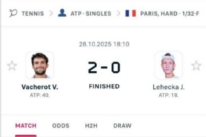 体育资讯10月28日讯 ATP1000巴黎大师赛首轮,持外卡出战的瓦舍罗6-1/6-3横扫14号种子莱赫卡,晋级第二轮。