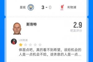 凌晨英超第11轮焦点战,利物浦0-3不敌曼城,近6轮英超吞下5场败仗。利物浦主帅斯洛特本场的战术安排,以及不换下萨拉赫的决定再次遭到球迷指责,吧友们给他打出了2.9分的超低分。
