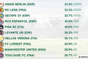 反击打法!五大联赛攻防转换占比排名:柏林联合居首,曼联第9位